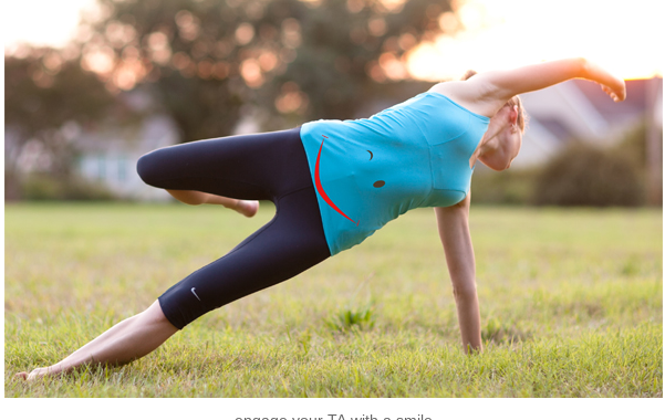 As I’ve mentioned before, engaging your TA muscle can be a little tricky but thankfully it responds really well to visualisations and breathing. Imagining a smile across your hip bones is a great way to wake up your TA. Think of the area about four inches below your belly button and above your pubic bone. Imagine a tiny smile starting in that area and visualise the smile corners growing wider and then curling up towards your hip bones. You’ll need to hold this ‘smile’ gently in and up and breathe into your rib-cage three-dimensionally.